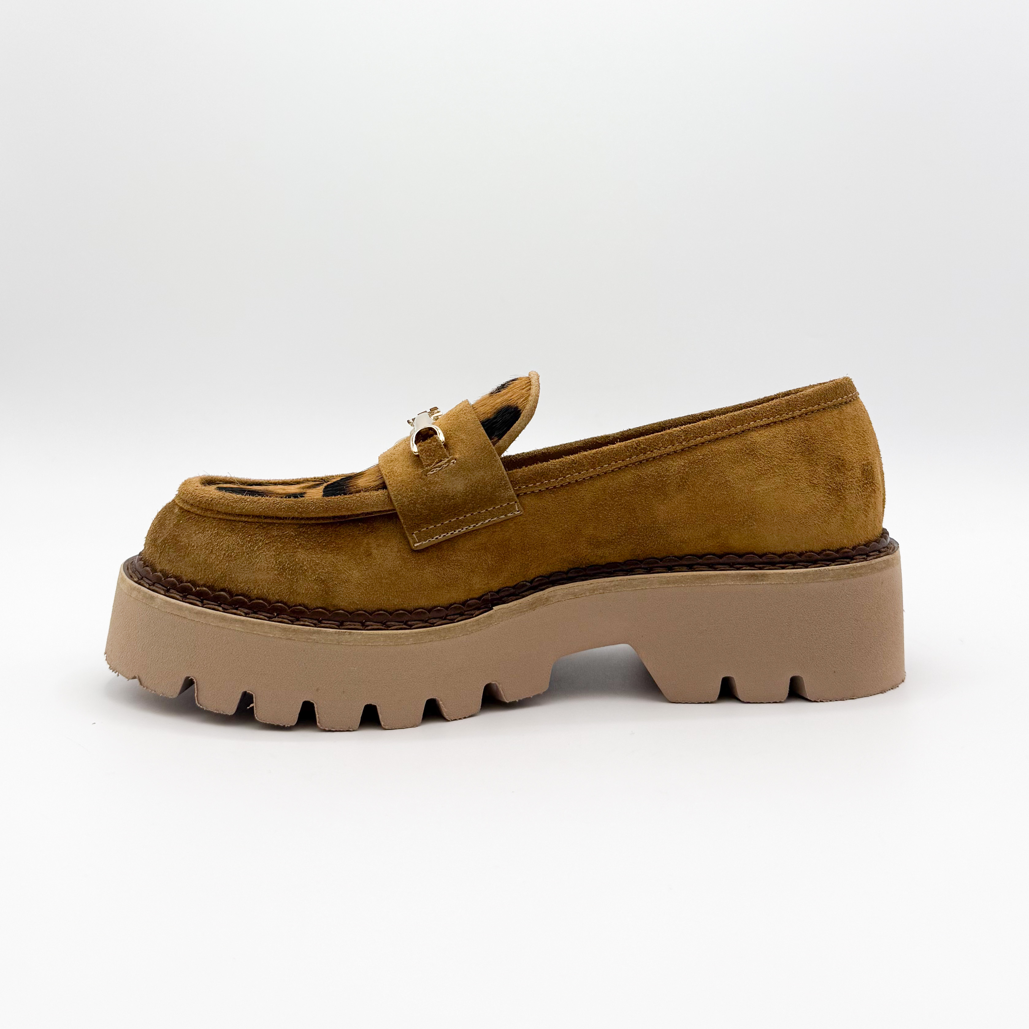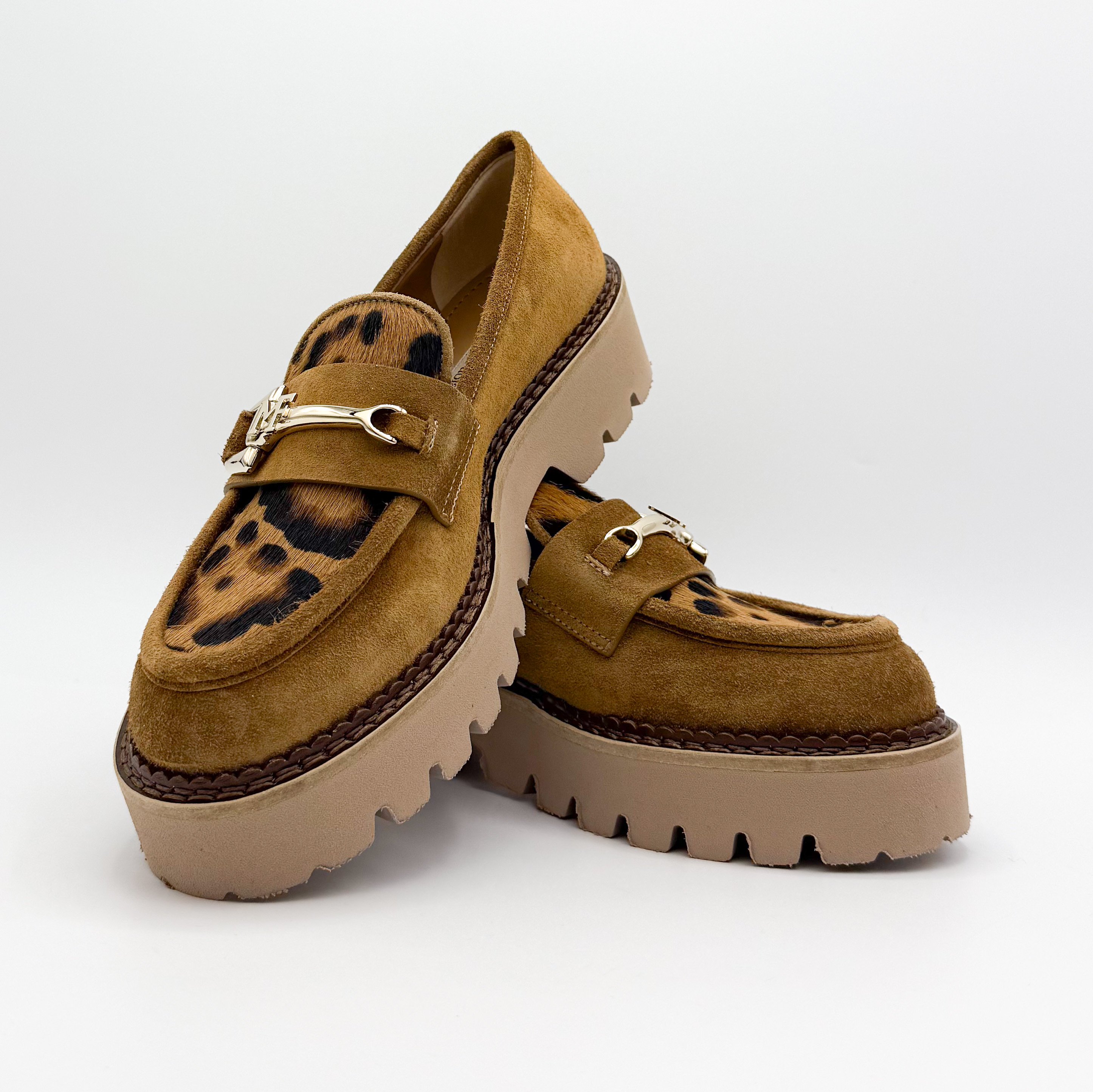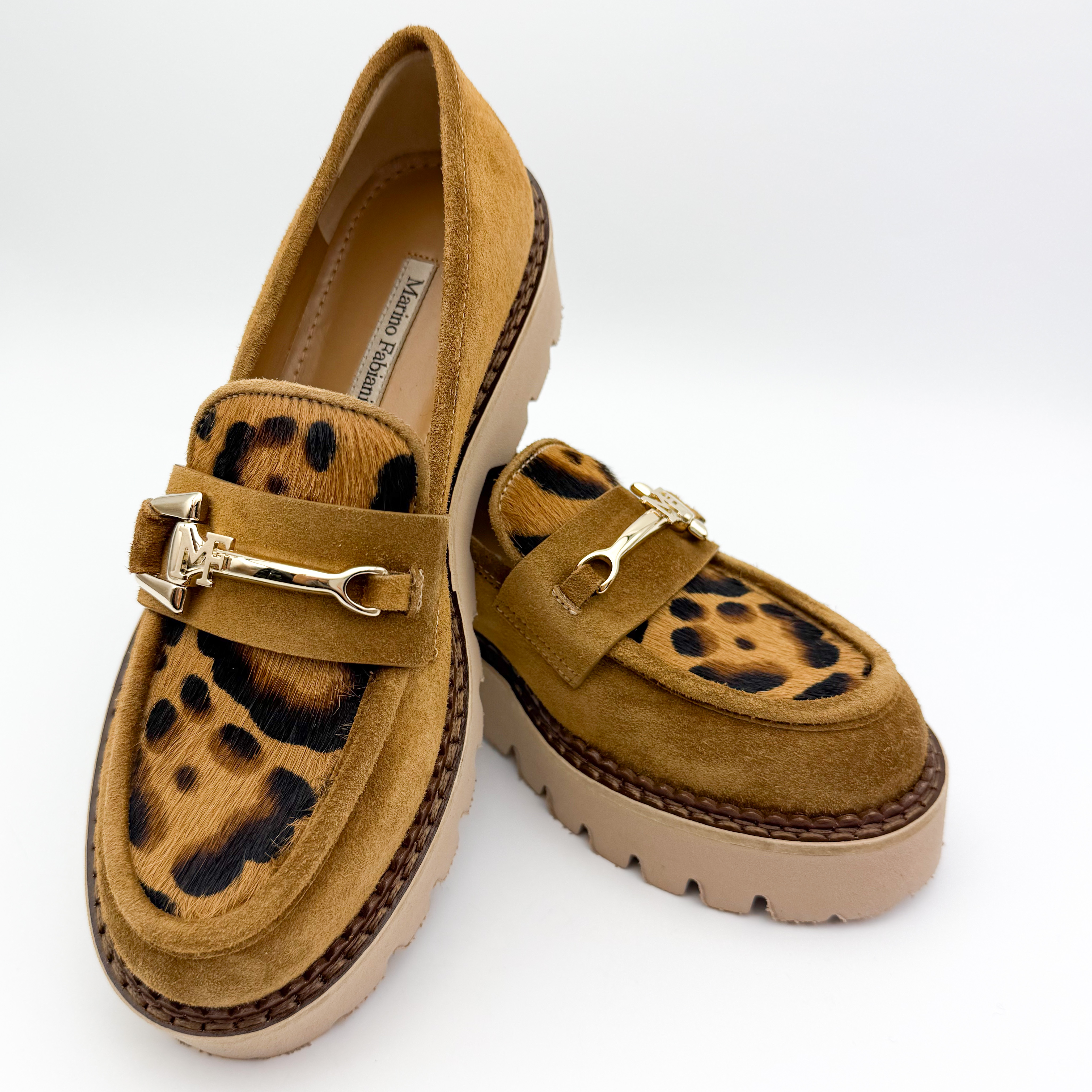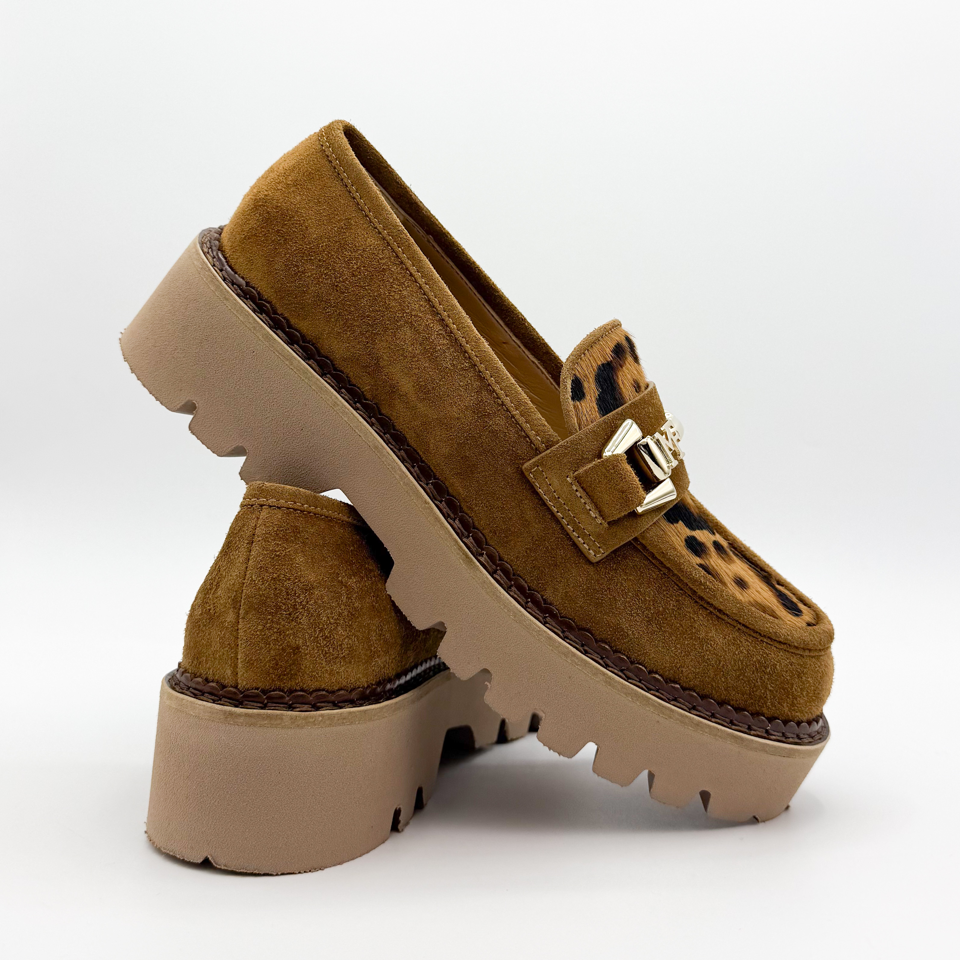 Wyjątkowe mokasyny Marino Fabiani to połączenie elegancji i odrobiny odwagi w stylu. Wykonane z miękkiego zamszu w ciepłym karmelowym odcieniu, ozdobione motywem panterki i złotą klamrą, przyciągają wzrok i dodają charakteru każdej stylizacji. Gruba, beżowa podeszwa gwarantuje komfort oraz stabilność na co dzień. Idealne do miejskich i casualowych zestawień.