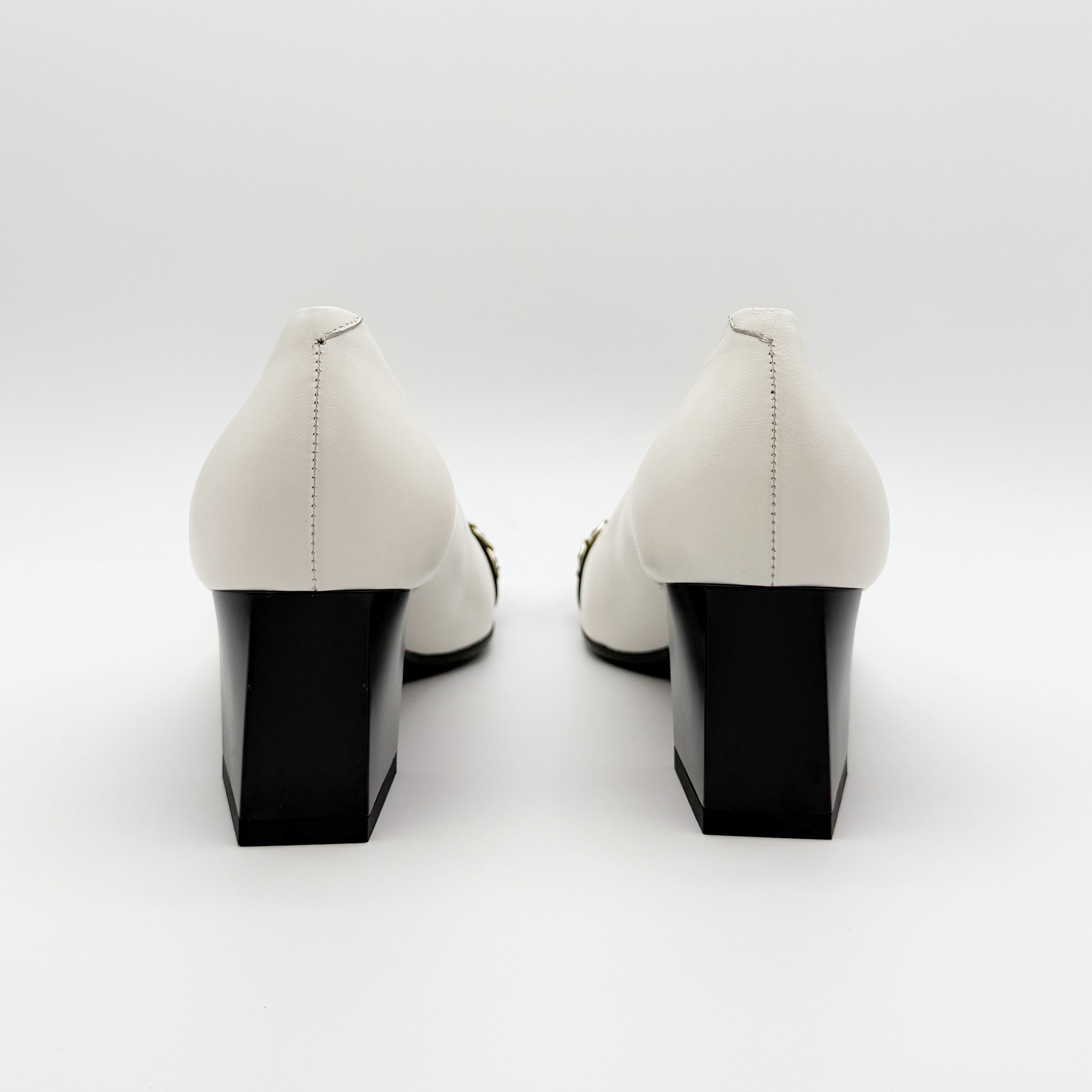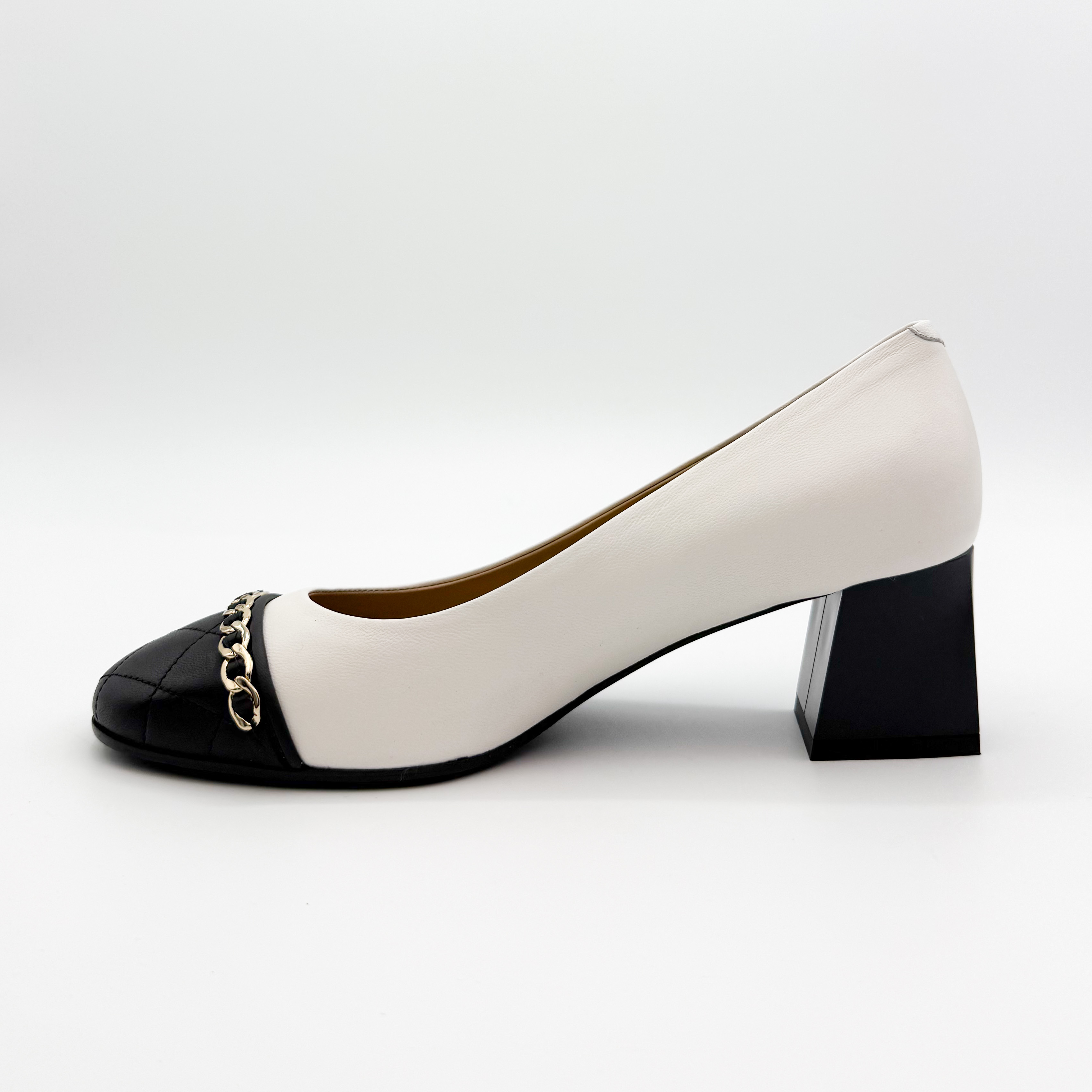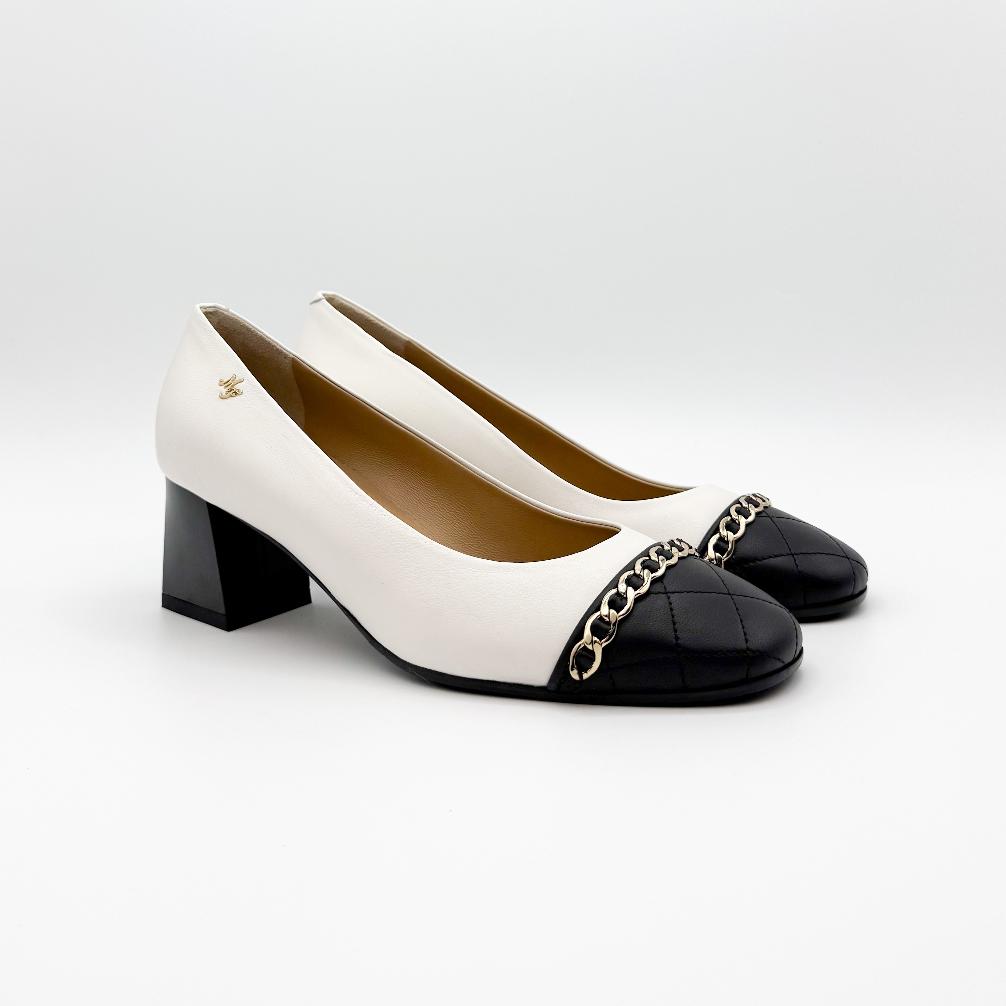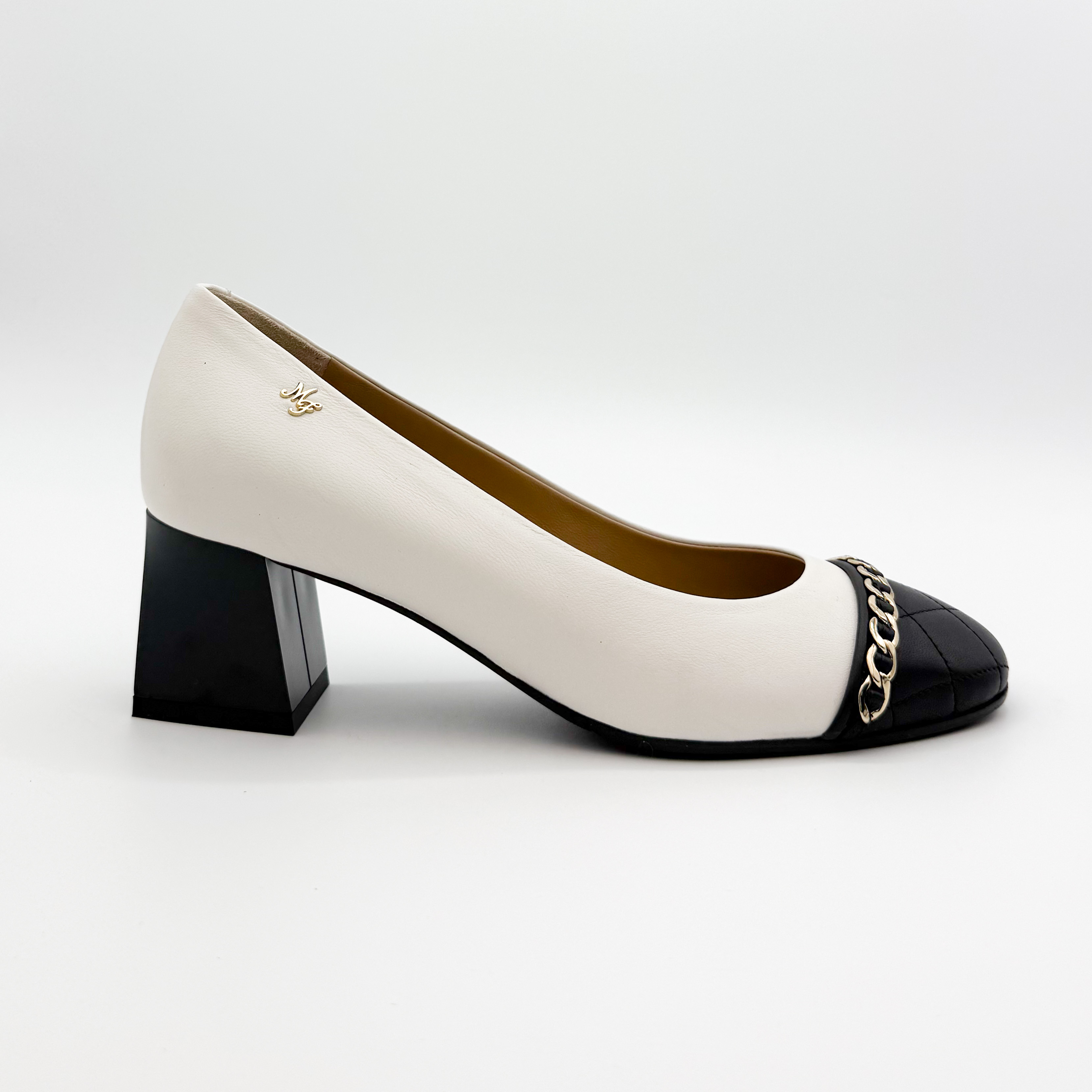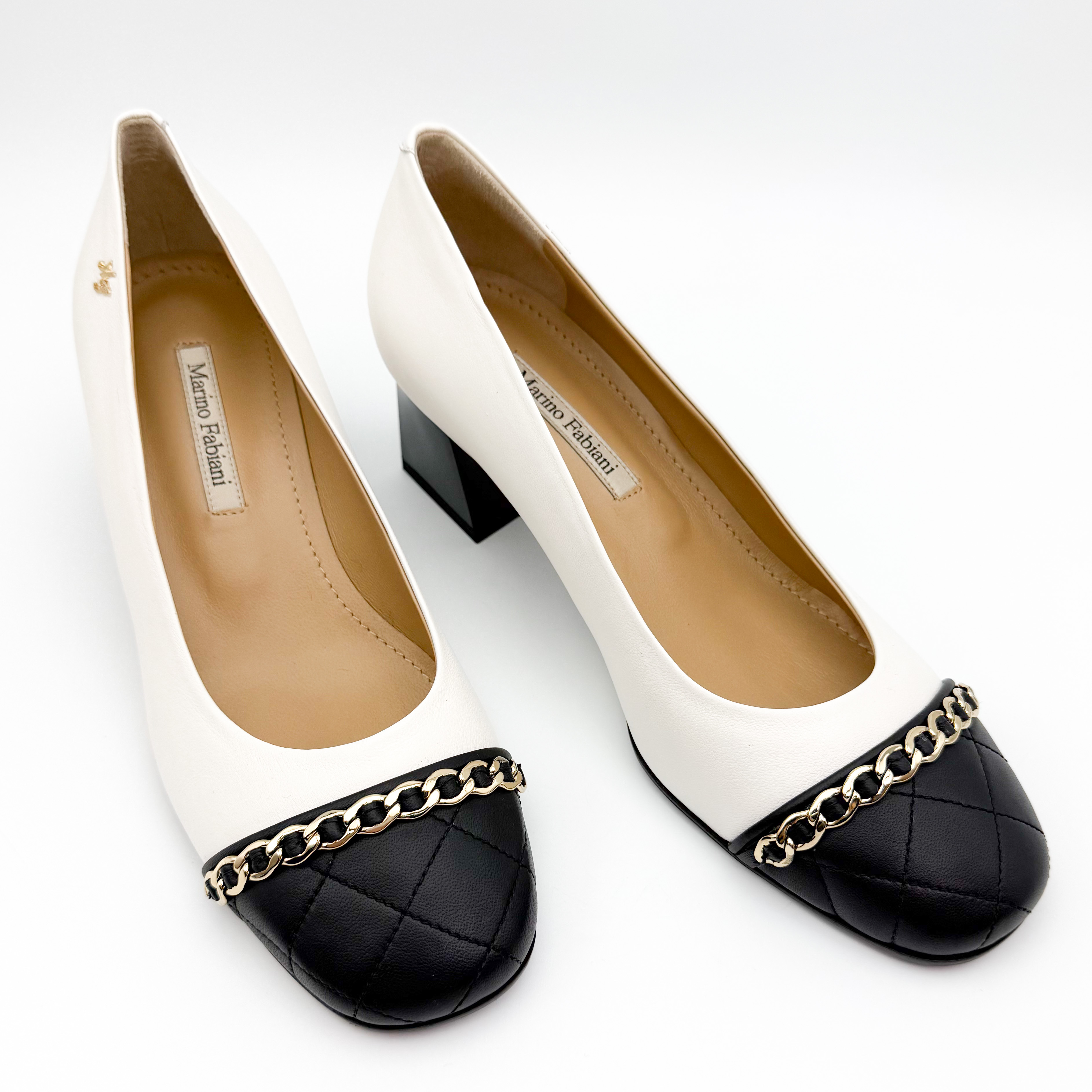 Eleganckie czółenka Marino Fabiani to połączenie klasyki i nowoczesnego stylu. Wykonane z najwyższej jakości skóry naturalnej w kontrastowym zestawieniu bieli i czerni. Pikowany nosek zdobiony złotym łańcuszkiem nadaje butom szykownego charakteru. Stabilny, szeroki obcas zapewnia komfort noszenia przez cały dzień. Idealne do eleganckich i biznesowych stylizacji.