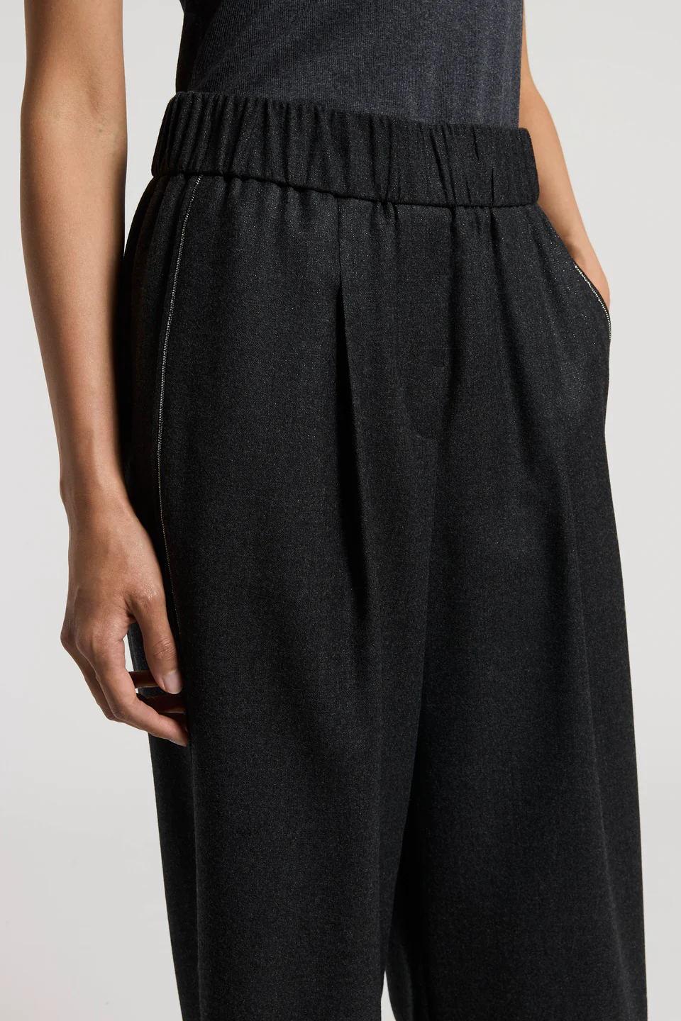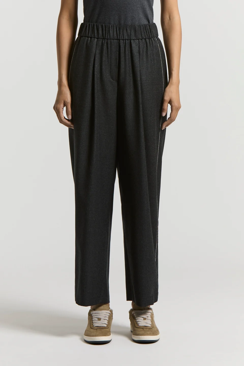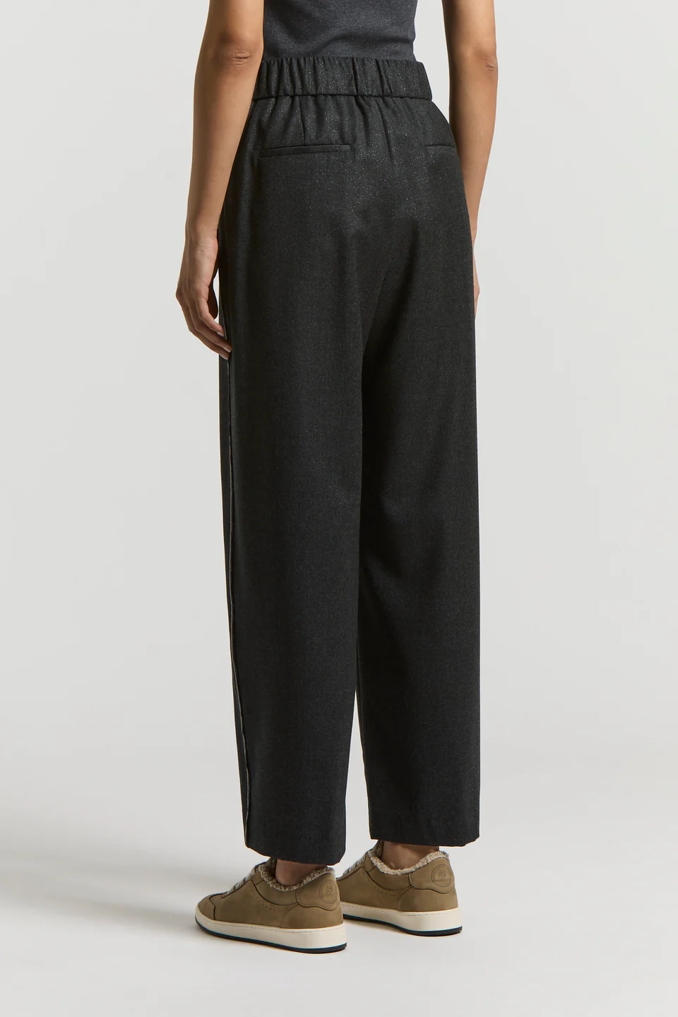 Tkanina została wzbogacona o metaliczną nitkę, która jest wpleciona w całą strukturę materiału, nadając spodniom delikatny, szlachetny połysk. Dodatkowym elementem dekoracyjnym są ozdobne paski po bokach nogawek, wykonane z finezyjnego łańcuszka, charakterystycznego dla estetyki marki Peserico. Całość dopełnia luksusowa podszewka z acetatu i cupro, gwarantująca lekkość i wysoki komfort noszenia.
