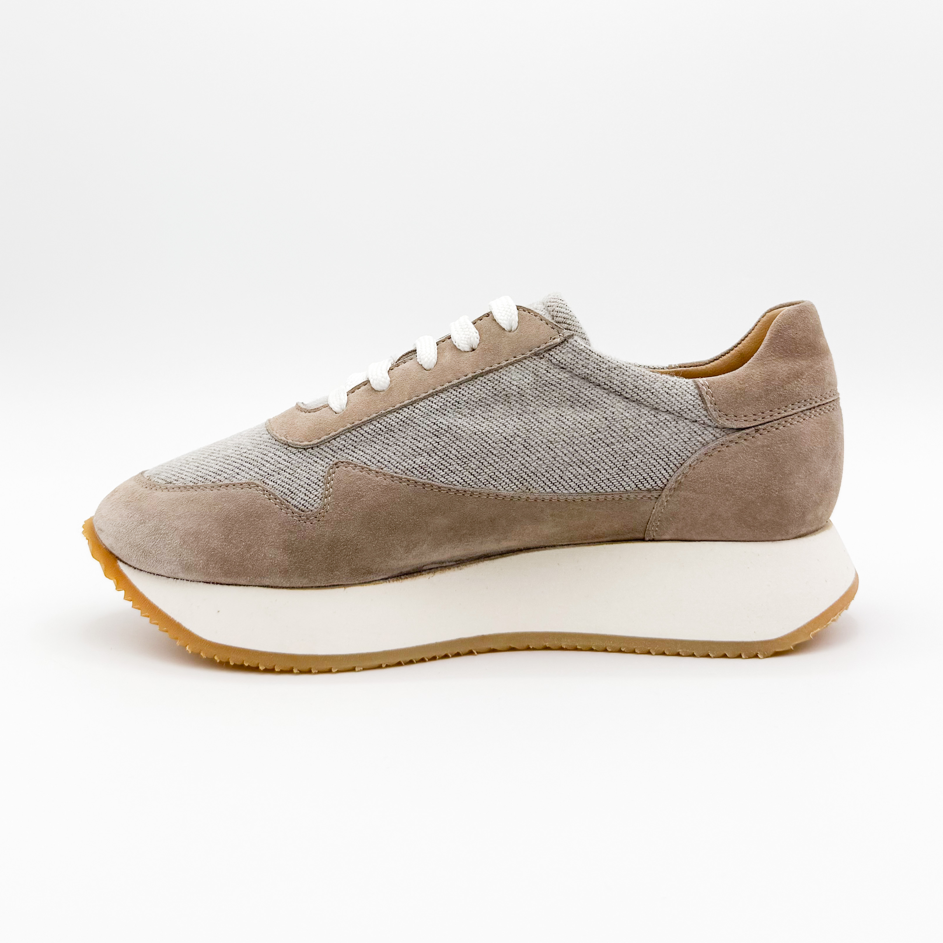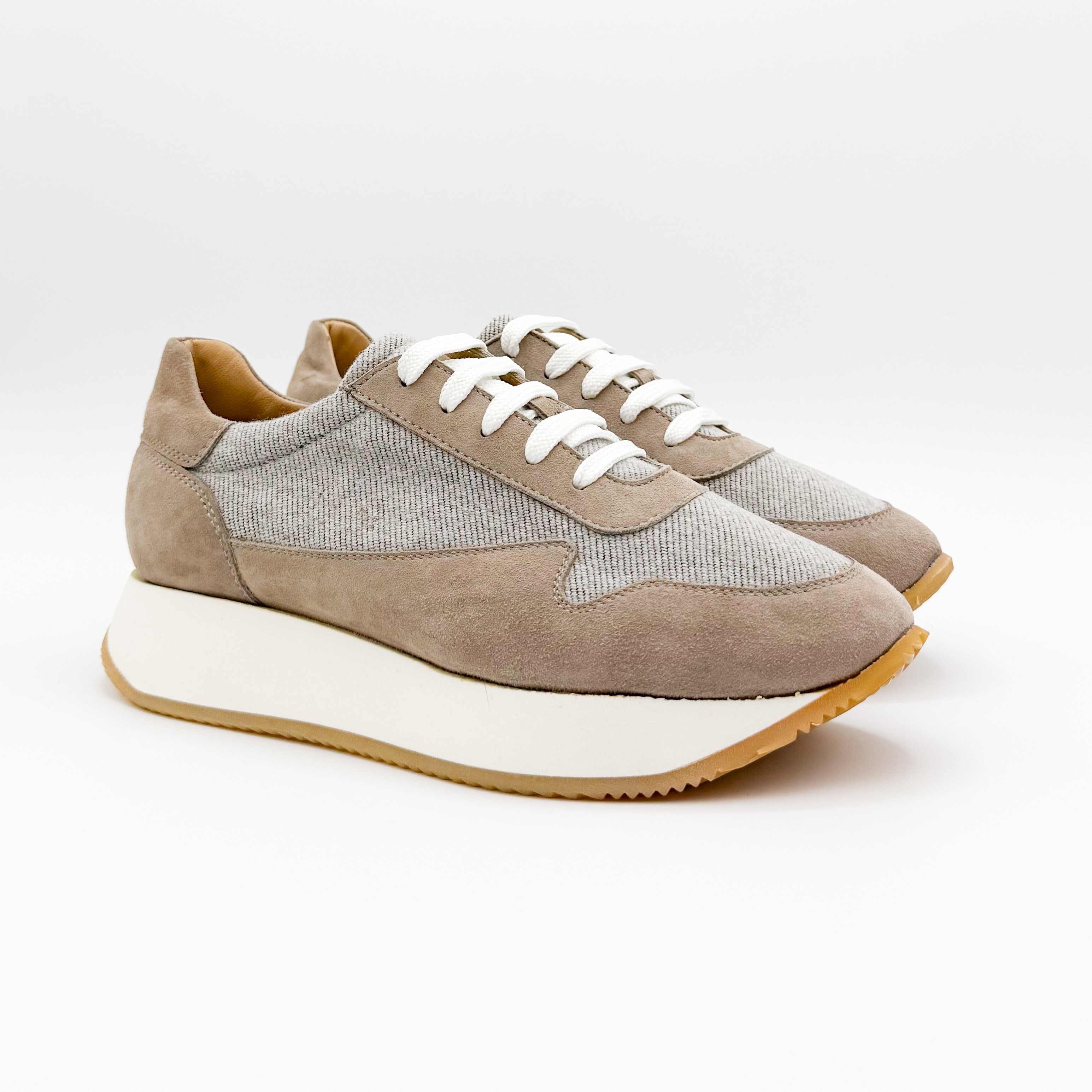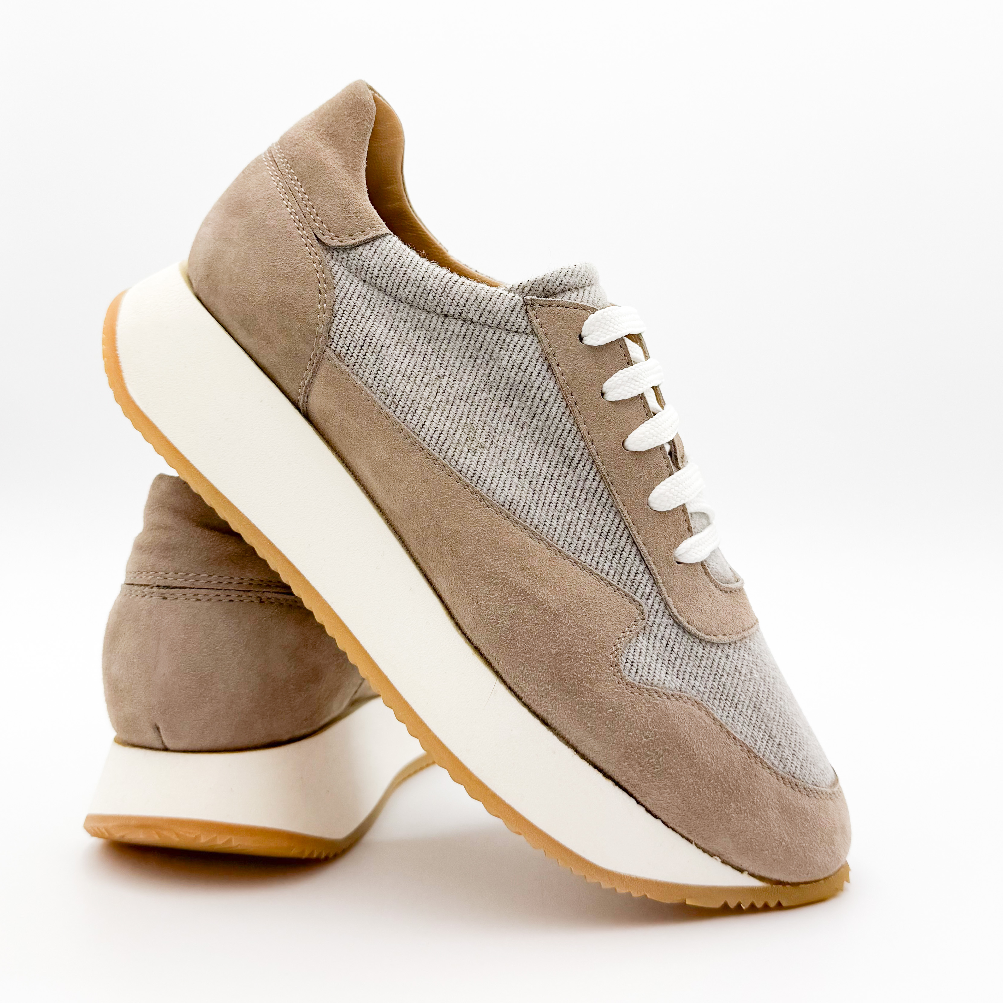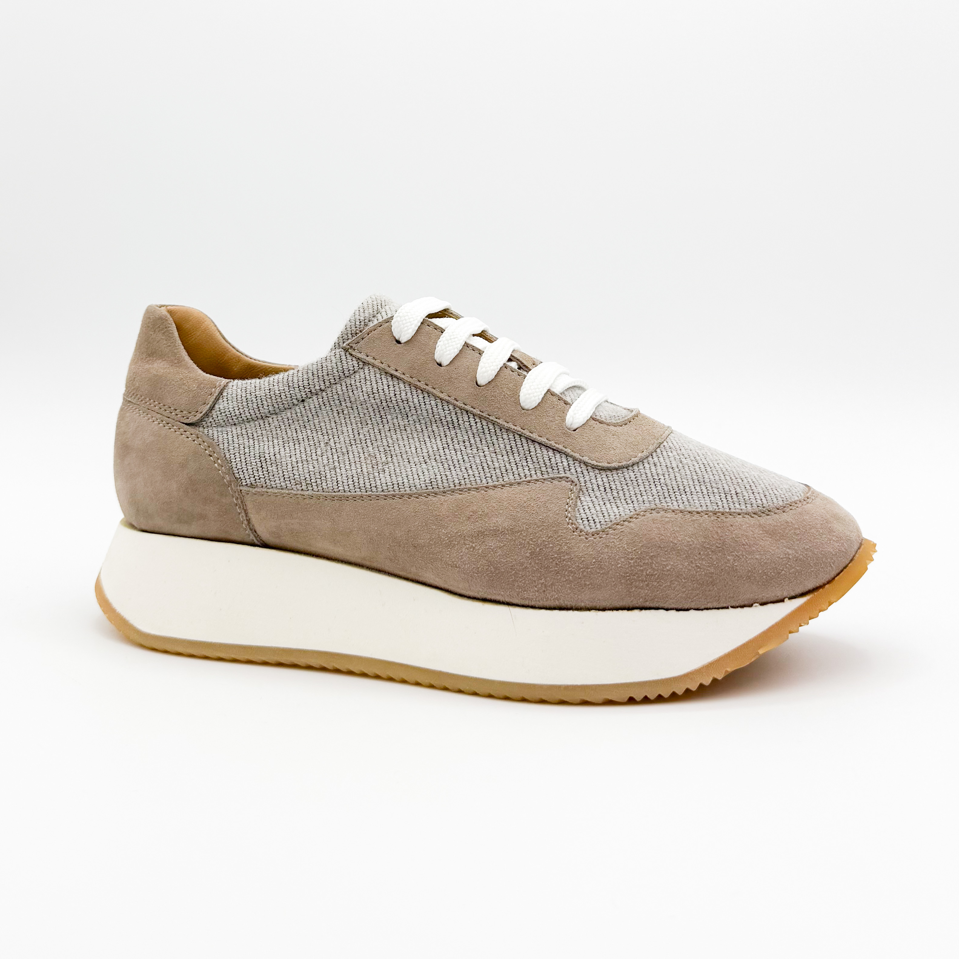 Damskie sneakersy Aldo Brue to połączenie subtelnej elegancji i włoskiej precyzji wykonania. Model utrzymany w beżowo-szarej tonacji zachwyca minimalistycznym designem, który doskonale komponuje się z casualowymi stylizacjami. Cholewka wykonana z naturalnego zamszu i tkaniny zapewnia lekkość oraz przewiewność, a podwyższona, kontrastowa podeszwa dodaje nowoczesnego charakteru i optycznie wysmukla sylwetkę.